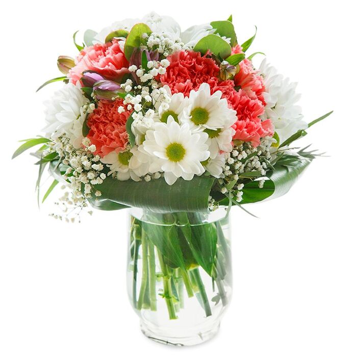Radiating a sense of freshness and joy akin to a morning walk along the Thames Path in Richmond, this vibrant bouquet bursts from a spotless white gift bag, inviting the eye and warming the heart. The artistry of the design is evident in every detail: frilled, coral and peach carnations impart softness and a gentle energy, while deep red blooms introduce passion and depth. Their layers are textured like ripples on the river, complemented perfectly by clusters of white daisies with sunny yellow-green centers-spirited and bright. Light, airy clouds of baby's breath dance among the larger flowers, bringing a dreamy innocence to the arrangement. Closed, purple-tinged buds peek from one side, hinting at the promise of tomorrow's blooms. Cradling the entire bouquet, swathes of rich, glossy green foliage create an embracing base and define the arrangement's rounded, generous form. Every stem is expertly placed, reflecting both the skill of Richmond's floristry and the welcoming spirit of the local community. The immaculate white gift bag elevates the entire scene, making it feel truly special-an ideal offering for birthdays, anniversaries, or a simple gesture of appreciation delivered across Richmond upon Thames. The whole presentation speaks of celebration and care, embodying the simple luxury of giving flowers in this historic riverside locale. This meticulously arranged bouquet, designed by florists in Richmond upon Thames, embodies spring's joyful renewal and the area's love of natural beauty. Viewed from above, crisp white daisies with radiant lime-green centers nestle among generous, coral-pink carnations, whose rich, ruffled petals bring warmth and exuberance. Wisps of feathery baby's breath weave between the blooms, imparting airy softness that feels as uplifting as strolling beside the Thames in May. Slender alstroemeria buds, tipped with gentle streaks of purple and deep pink, peek discreetly through lush eucalyptus and glossy, dark foliage-each element thoughtfully selected for balance and tonal harmony. The bouquet is framed by rich greenery and set against a brilliant white background, honouring the vibrant colours and textures. This balanced arrangement expresses joy, appreciation, and gentle encouragement, well-suited to birthdays or as a fresh delivery for life's special moments in Richmond. Its welcoming palette and elegant form echo the gardens and parks that make this borough beloved, making the bouquet ideal for either home display or thoughtful gifting. This bouquet flourishes with the brilliance of a Richmond upon Thames spring morning, radiating joy and serene grace from its place in a clear glass vase. At the heart, plump coral carnations-each densely ruffled and delicately hued-lend vibrance and personality, catching the light with every curve. Crisp white chrysanthemums and playful daisy-like blooms open wide around them, their green-yellow centers gleaming as if kissed by sunbeams streaming across Richmond Green. Threads of airy white baby's breath weave between the larger flowers, creating a cloud-like softness that tempers the vivacity of the central blooms. Peeking shyly from the arrangement's edge, closed magenta alstroemeria buds introduce a quiet splash of berry colour, promising more blooms to come in the days ahead. Lush, deep green leaves-both broad and slender-cradle the florals, grounding the design with organic calm and echoing the canopies found in Kew Gardens. The clear water in the vase gives a fresh undercurrent, magnifying the stems and underscoring the quality of the flowers, freshly prepared by local experts and ready for prompt delivery throughout Richmond. Gentle, even lighting allows every petal, texture, and shade to shine without distraction-a perfect, uplifting arrangement for birthdays, thank-yous, or simply bringing a note of cheer to a loved one in this scenic London borough.
